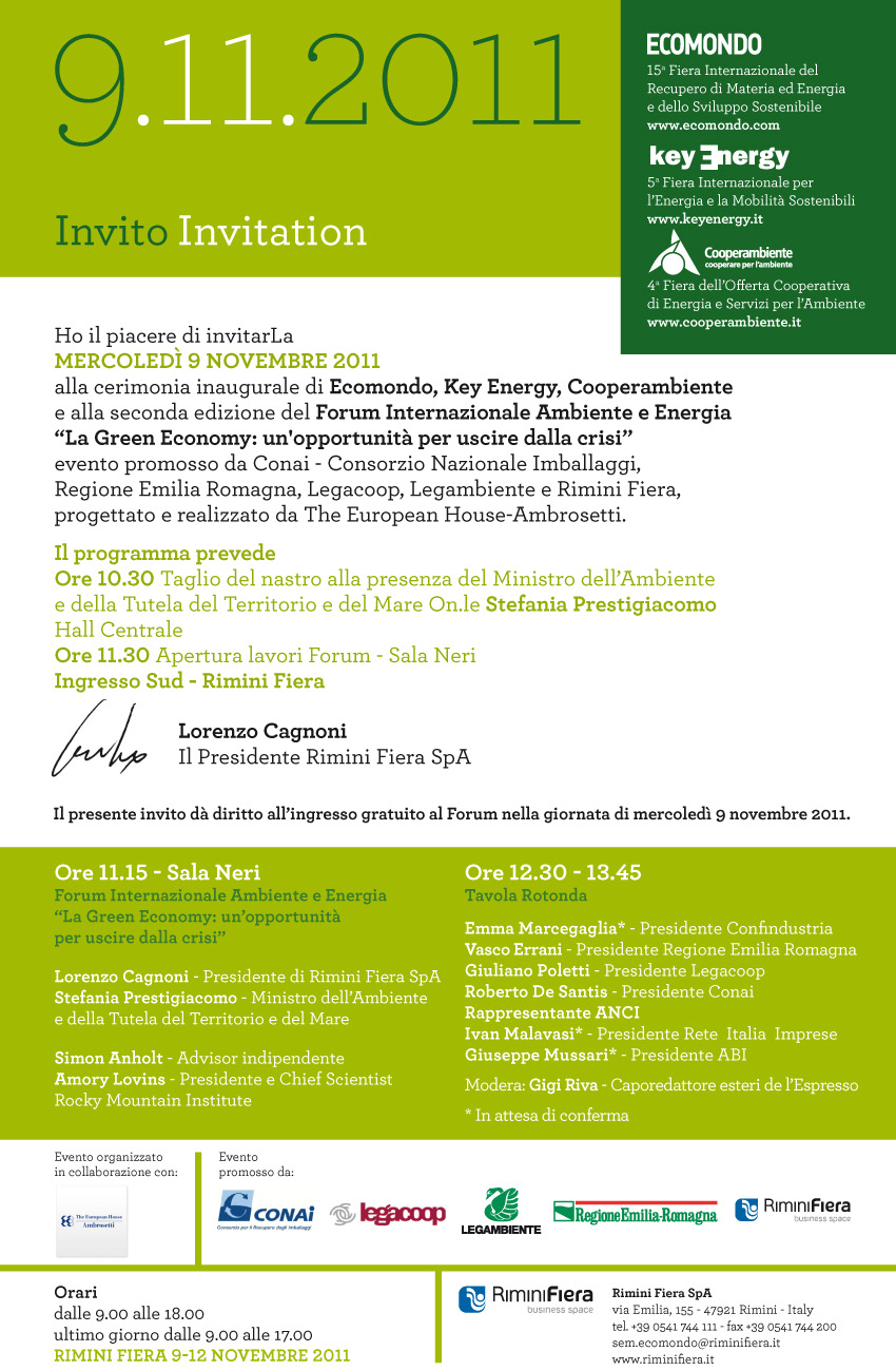 La 15esima edizione di Ecomondo è alle porte. Il prossimo 9 novembre a Rimini la cerimonia di apertura vedrà la partecipazione del Ministro Prestigiacomo (MATTM) e di seguito il Forum internazionale Ambiente ed Energia su “la Green Economy, un’opportunità per uscire dalla crisi” che mira non solo a creare un serio dibattito sugli ostacoli della green economy ma anche di far emergere dagli interlocutori presenti un documento per proteggere e supportare concretamente le imprese del settore (Programma scaricabile).